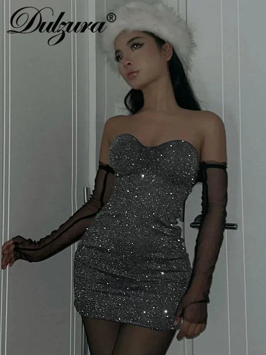 Dulzura Bling Glitter Sequins Sexy Y2K Clothes Sleeveless Backless Tube Ruched Bodycon Mini Dress For Women Club Birthday Party