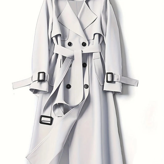 Solid Double Breasted Belt Trench Coat, Elegant Long Sleeve Coat For Fall & Winter