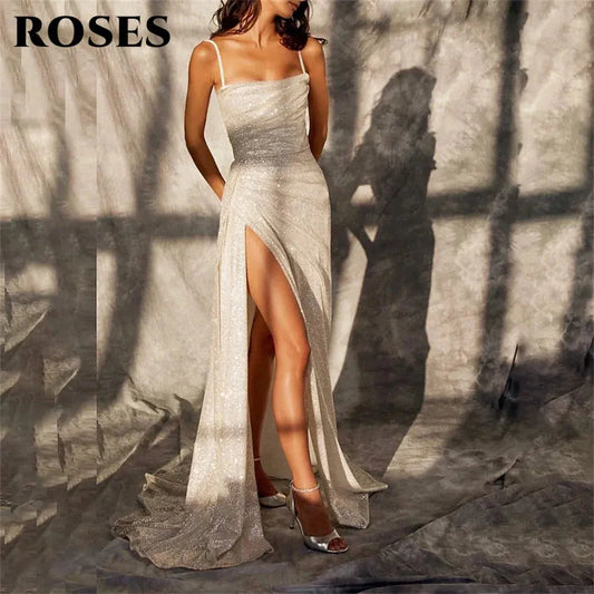 ROSES White Glitter Evening Dresses Spaghetti Strap Prom Dresses for Wedding Side Split Mermaid Sweep Train فستان حفلات الزفاف