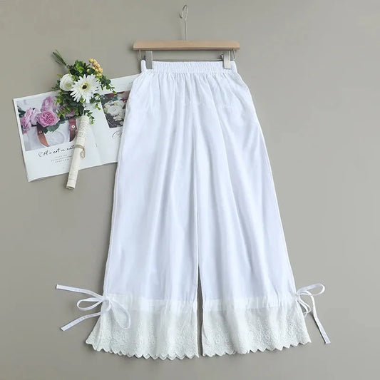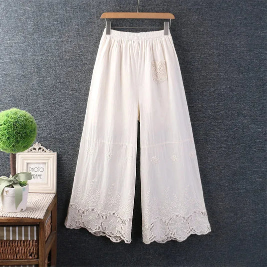 Spring Summer Light Thin Cotton Embroidered Pants Women Elastic Waist Tiny Hollow Pocket Wide Leg Pants Duobao0319-02