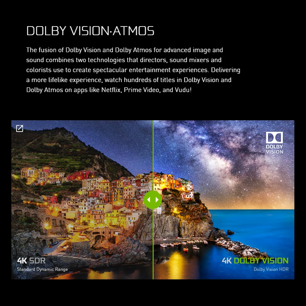 Level up to SHIELD TV Pro for more storage space, two USB 3.0 ports for expandability, and PLEX Media Server. Enjoy a cinematic experience with visuals brought to you by Dolby Vision HDR, and immersive audio with Dolby Atmos surround sound. Packed with features to make even the most demanding users proud.