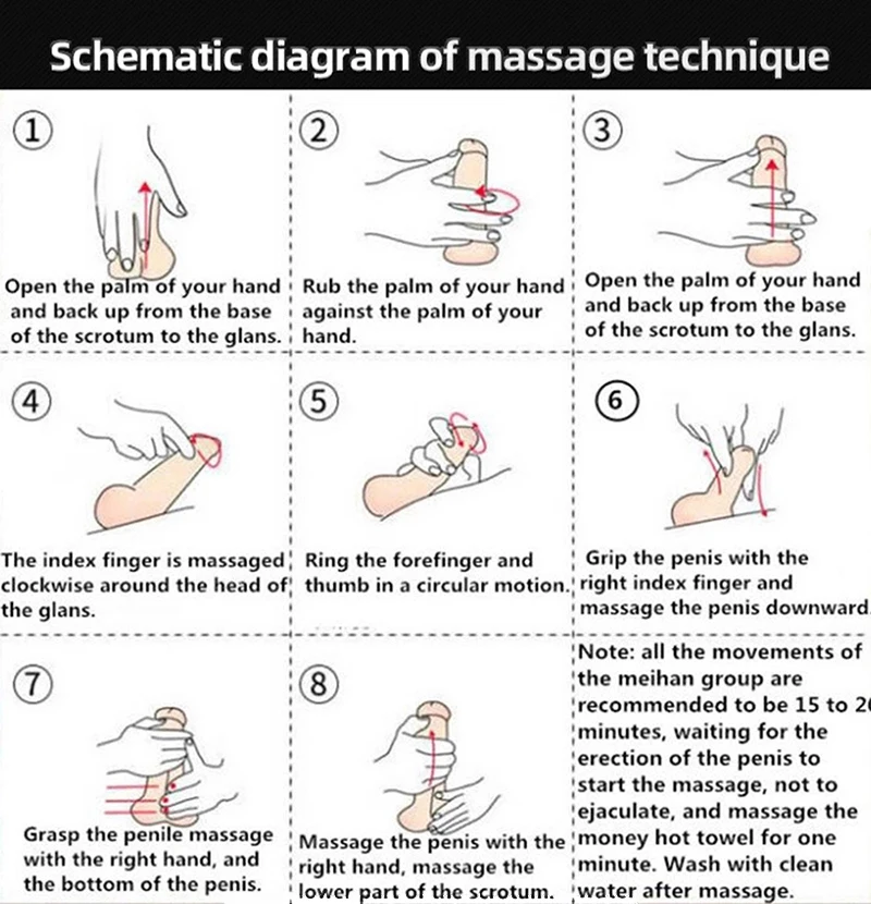 After bathing, dry the water and place 5-10 drops on your hands. Gently spread the oil evenly, avoiding the glands and urethra, and massage from top to bottom until the oil disappears. If it's too greasy, blot dry with a rag or paper towel. Continue for 2-10 minutes until the temperature rises slightly. Use it daily to improve performance and results.